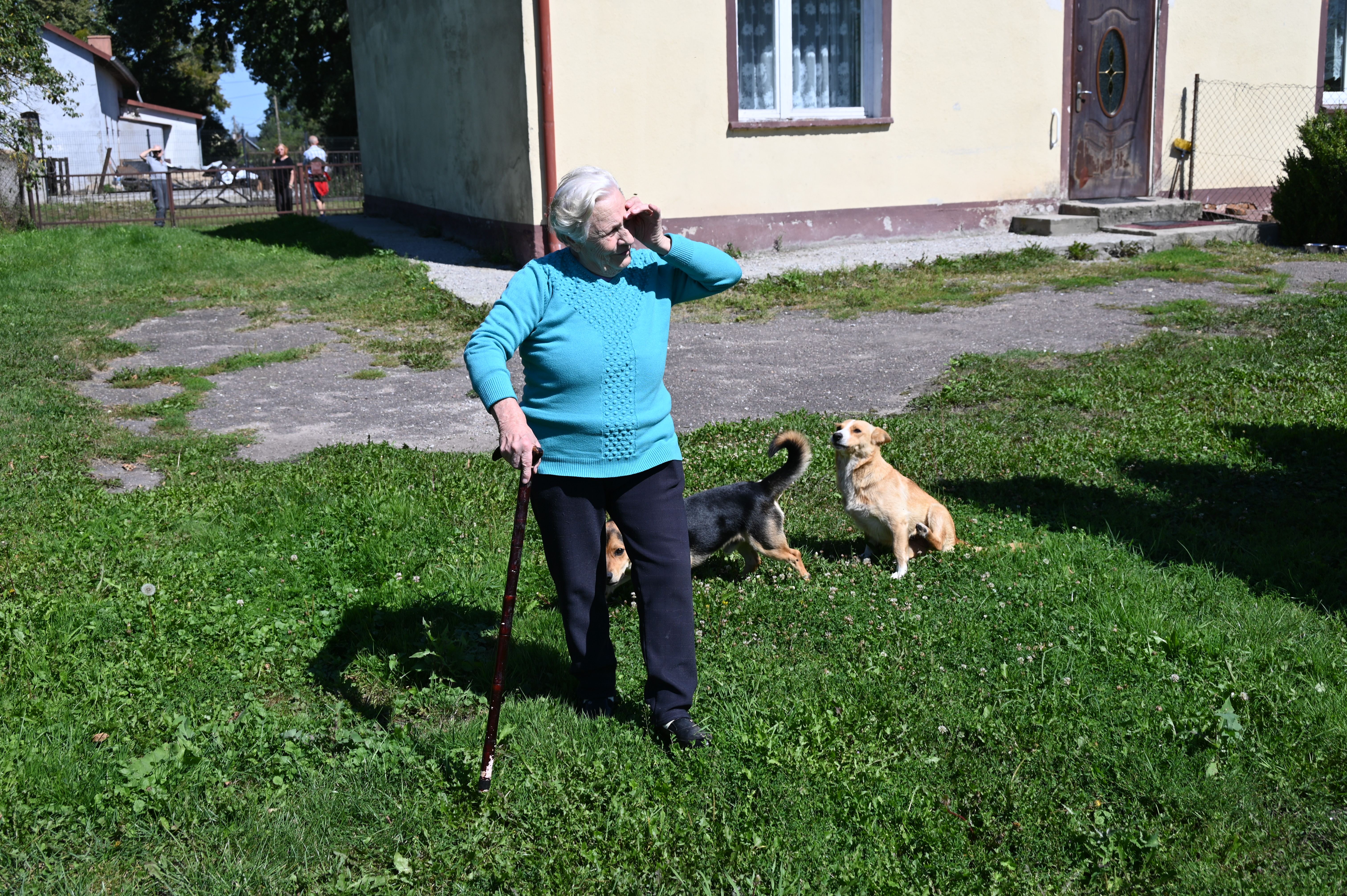 Był w naszej wyprawie także wspomniany aspekt sentymentalny, wspomnieniowy. Mieszkanka naszego Domu, pani Barbara, powróciła w rodzinne swoje strony, do miejsc, gdzie upływało całe jej życie, zanim nie trafiła pod naszą opiekę. Słuchając jej rwanych, czasami nieskładnych, bo przesyconych wzruszeniem opowieści, przypomnieliśmy sobie zdanie tak pasujące do tego dnia, napisane przez Zoë Marriott w Królestwie Łabędzi („Okruchy wspomnień wydają się wzbijać i tańczyć jak drobinki kurzu w promieniach słońca”). To właśnie panią Barbarę witały pieski przed rodzinnym domem na posesji nr 1 (Perełka i Azorek), na cmentarzach w Świętym Gaju i Kwietniewie dumaliśmy przy grobach Jej najbliższych, wyobrażaliśmy sobie jak pieszo podąża drogą „do Doliny” (to stara nazwa obecnego Starego Dolna, pamiętana chyba tylko przez mieszkańców najbliższych okolic) i jak w białej długiej sukni wiosną, „nie pamiętam jednak roku”, wchodzi do przepełnionego gośćmi wnętrza kościółka w Świętym Gaju, by złożyć przysięgę ślubną… I to była ostatnia para obecna w czasie naszej wyprawy: młodzi, szczęśliwi i piękni, dziś rozdzieleni lecz utrwaleni we wspomnieniu, jak na zdjęciu.