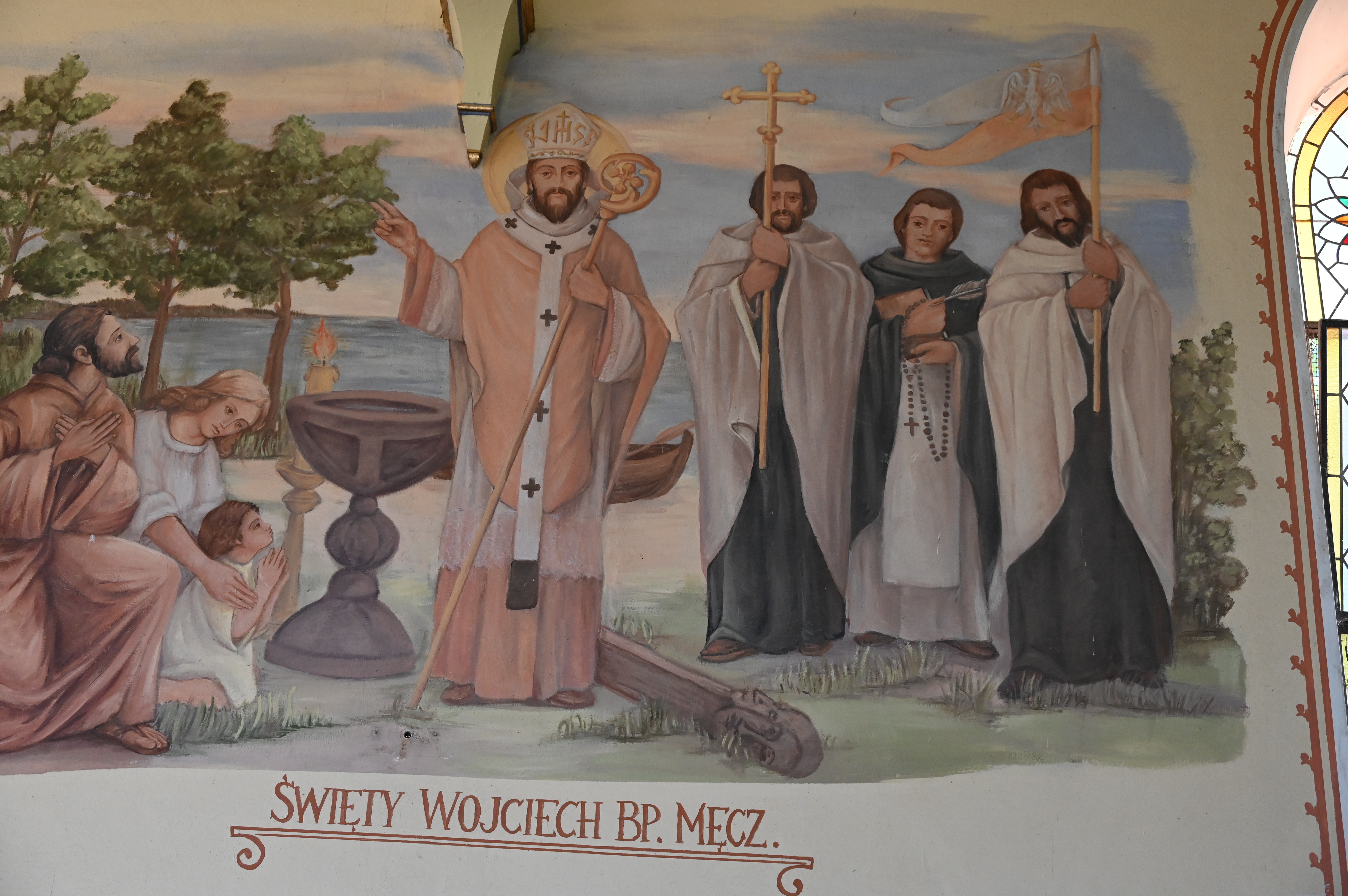 Arcyważną rolę podczas niej odegrał nasz gospodarz i przewodnik w jednej osobie – ksiądz Piotr Łatacz, proboszcz parafii Podwyższenia Krzyża Świętego w Kwietniewie. W sposób niezwykle interesujący opowiedział nam najpierw o dziejach niewielkiego wprawdzie pod względem skali architektonicznej kościółka w Świętym Gaju, wielkiego jednak przez swoją rangę i znaczenie w dziejach naszej Ojczyzny. Nosi on wezwanie św. Wojciecha, patrona Polski i polskiego kościoła, w 1989 roku został podniesiony do rangi Sanktuarium po sprowadzeniu z Gniezna relikwii tego świętego, bez poświęcenia którego podczas misji do pogańskich Prusów, nie bylibyśmy dzisiaj tym, kim jesteśmy.