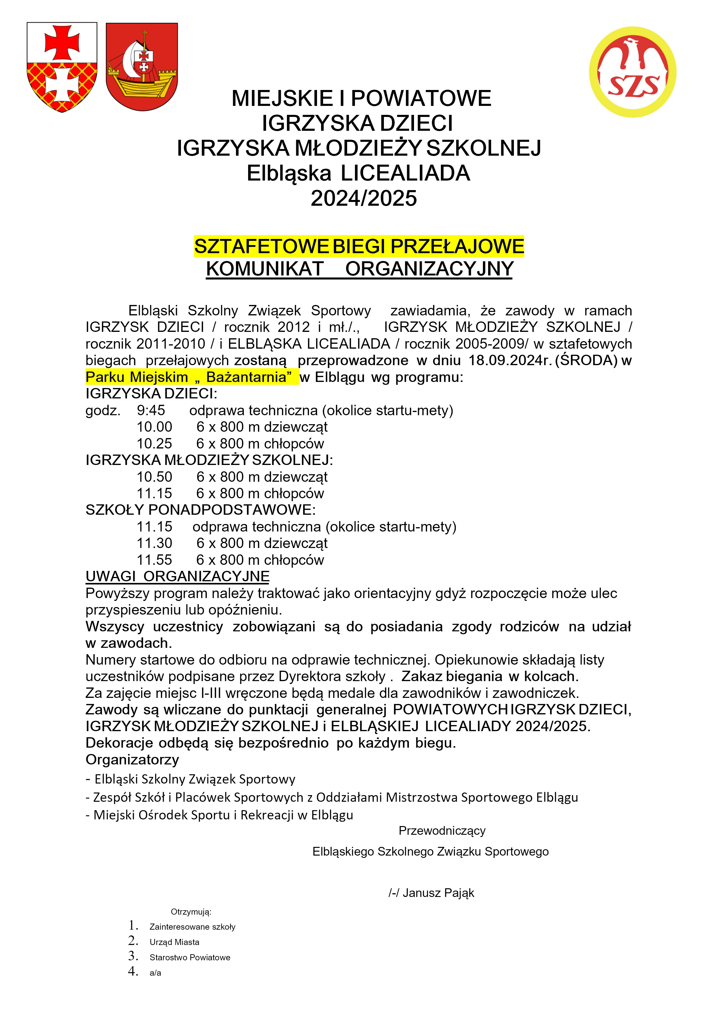 Dnia 18 września w środę od godziny 9.45 w Parku Miejskim "Bażantarnia" w Elblągu odbędą się MIEJSKIE I POWIATOWE IGRZYSKA DZIECI, IGRZYSKA MŁODZIEŻY SZKOLNEJ, ELBLĄSKA LICEALIADA 2024/2025.