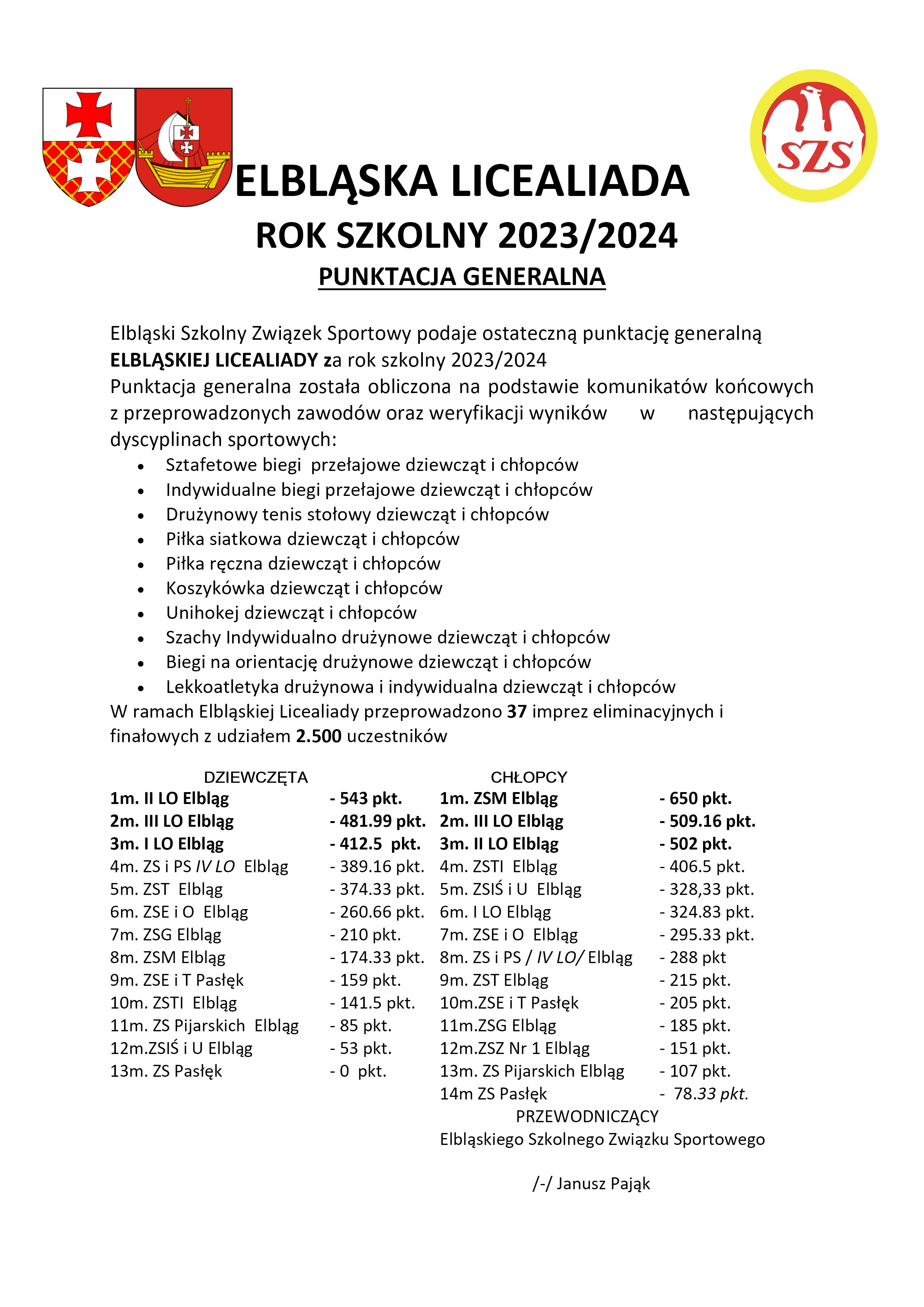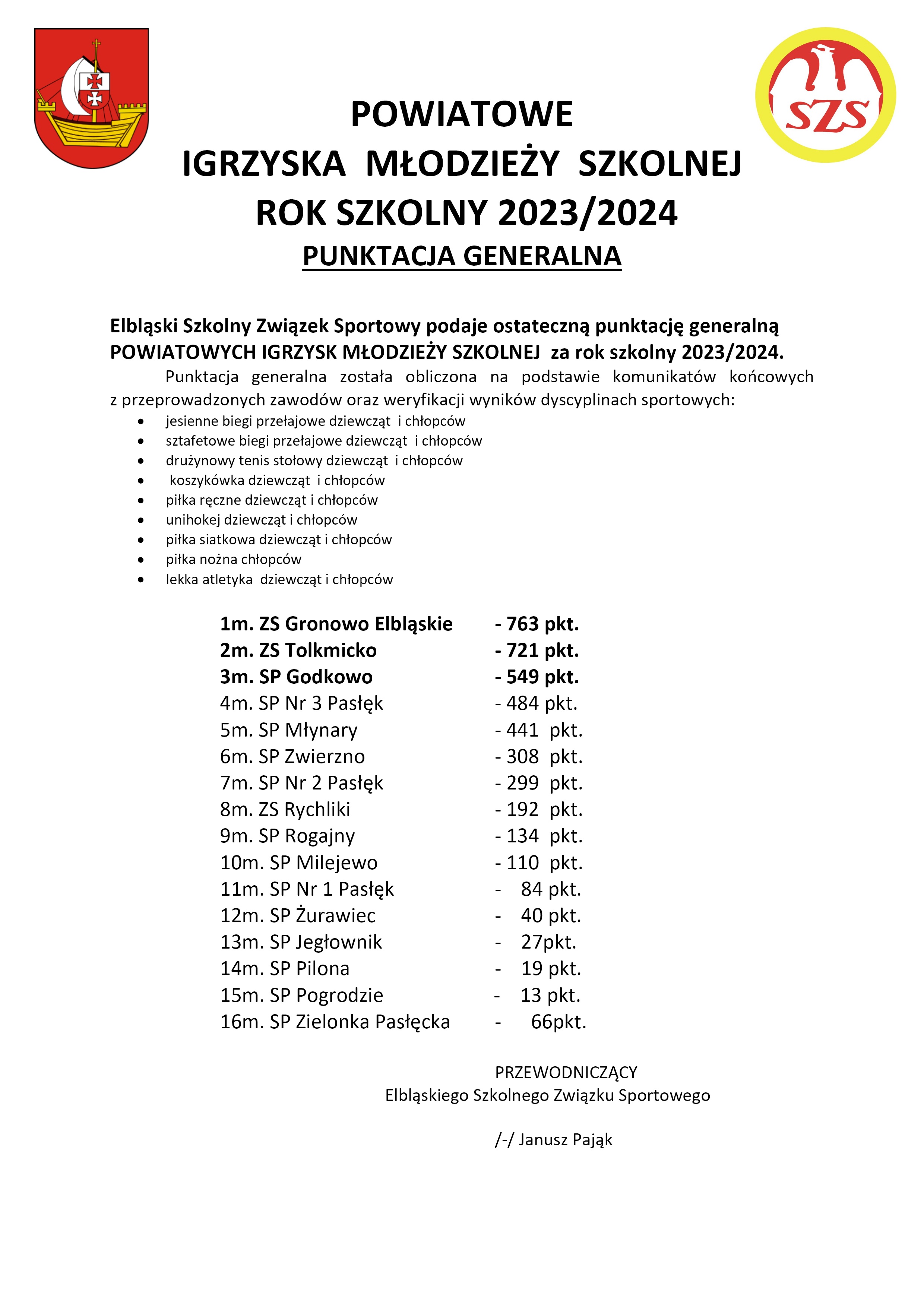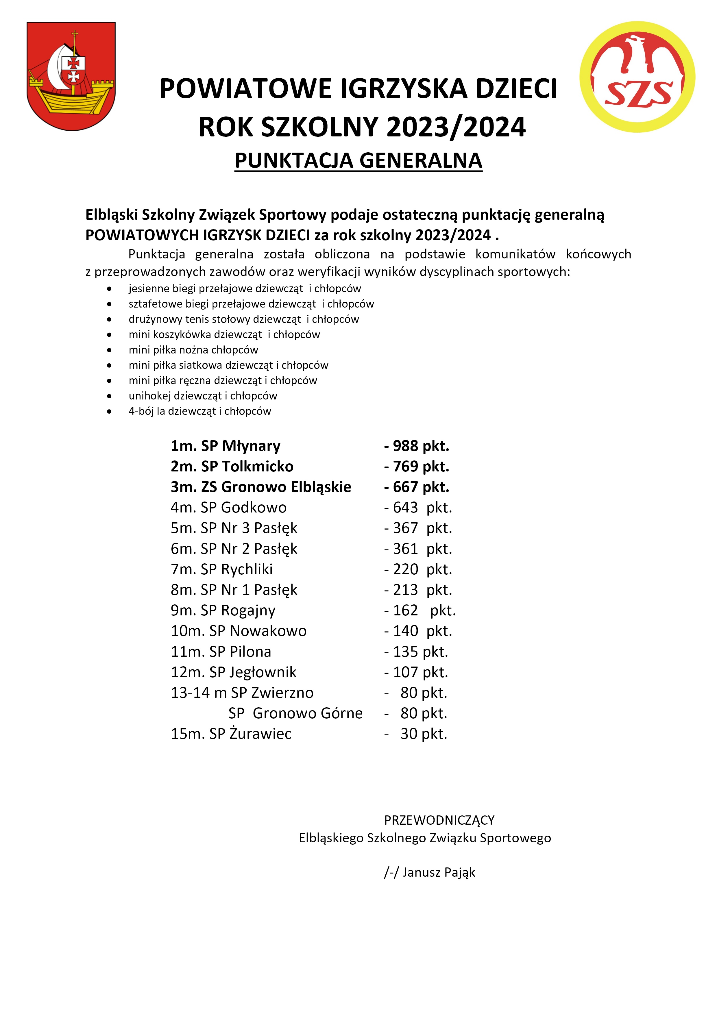 Elbląski Szkolny Związek Sportowy przekazuje ostateczną punktację generalną POWIATOWYCH IGRZYSK DZIECI za rok szkolny 2023/2024, ELBLĄSKIEJ LICEALIADY za rok szkolny 2023/2024 oraz POWIATOWYCH IGRZYSK MŁODZIEŻY SZKOLNEJ za rok szkolny 2023/2024.
