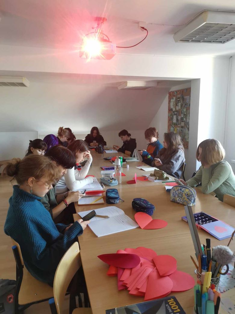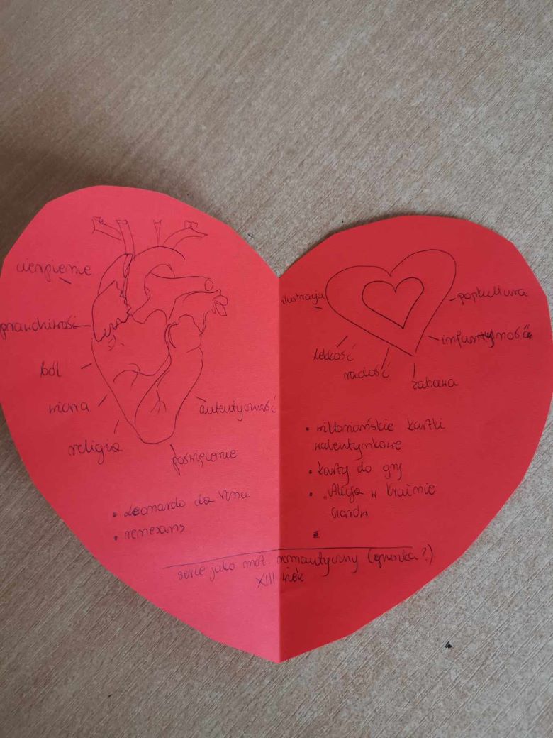 W akcję włączyła się również pani Paulina Łuczak i dzięki temu na zajęciach historii sztuki uczniowie pracowali odkrywając motywy serca w kulturze. Poznawaliśmy znaczenia i niuanse oraz konteksty tego popularnego motywu w ikonografii różnych epok (od prehistorii do współczesności. Poddaliśmy analizie między innymi: przedstawienie serca w manuskryptach średniowiecznych, szkicach Leonarda da Vinci, wiktoriańskich kartkach walentynkowych, malarstwie Fridy Kahlo i twórczości Rafała Olbińskiego.