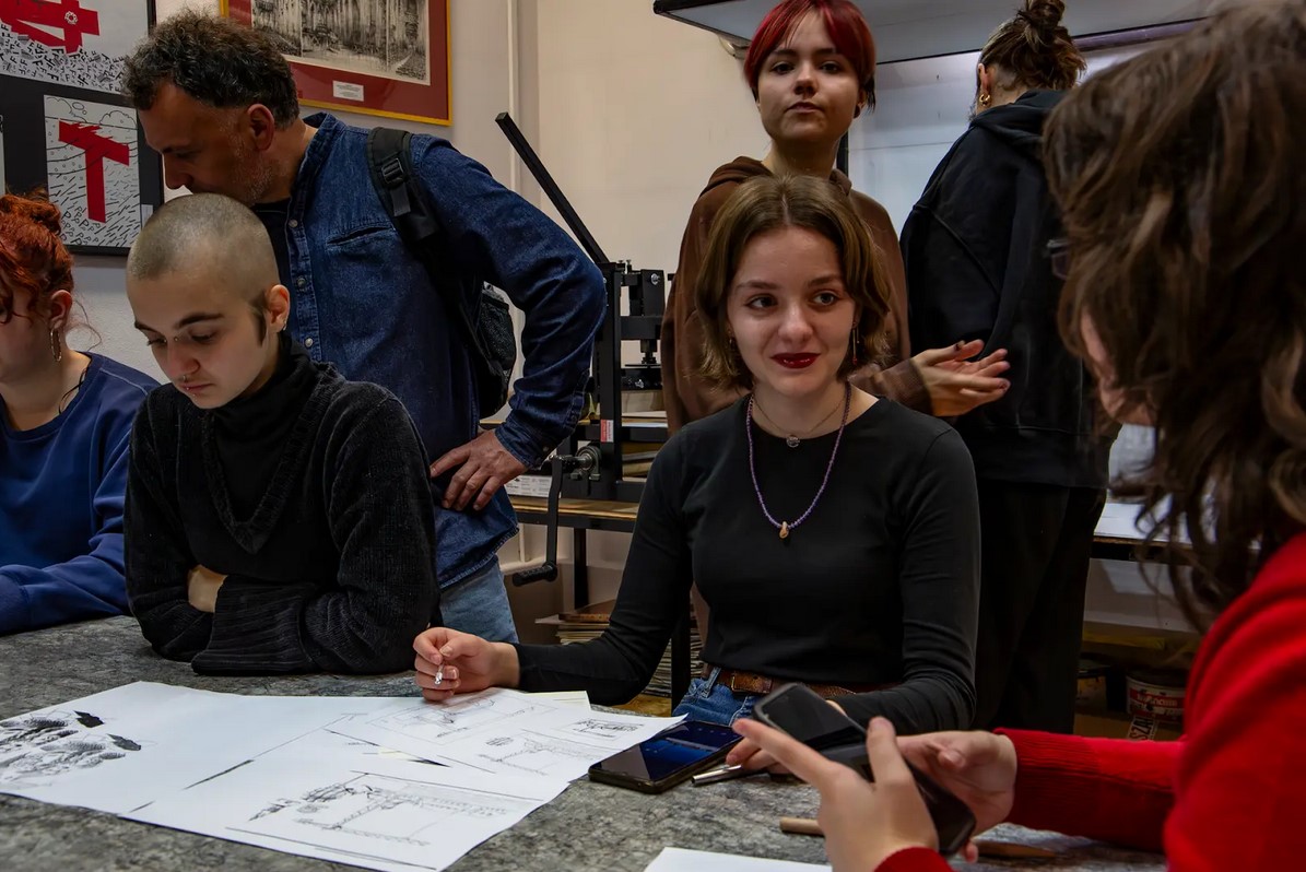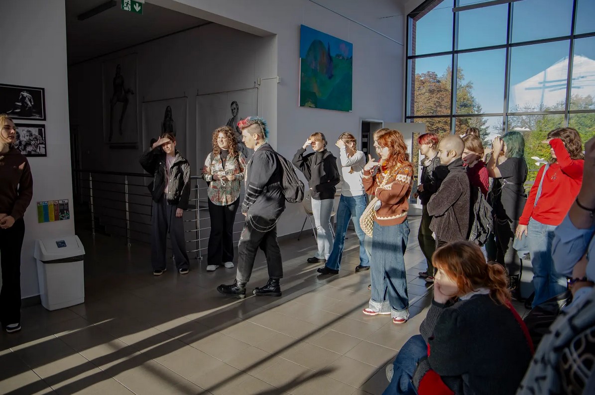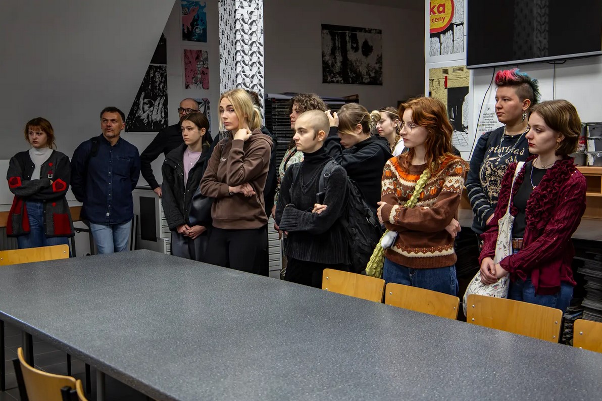 Uczniowie i ich opiekunowie mieli okazję zwiedzić miasto udając się kuratorskim Szlakiem Form Przestrzennych, uczestniczyć w wykładzie o retrowersji, przebywać w niezwykłej przestrzeni Galerię El oraz obejrzeć nasze liceum. Wspólne rozmowy o sztuce, dzielenie się doświadczeniem i własnym spojrzeniem na świat stały się bodźcem do stworzenia artystycznych kart z podróży w technice druku płaskiego- serigrafii oraz wklęsłodruku, akwaforty w połączeniu z drukiem płaskim- offsetem.