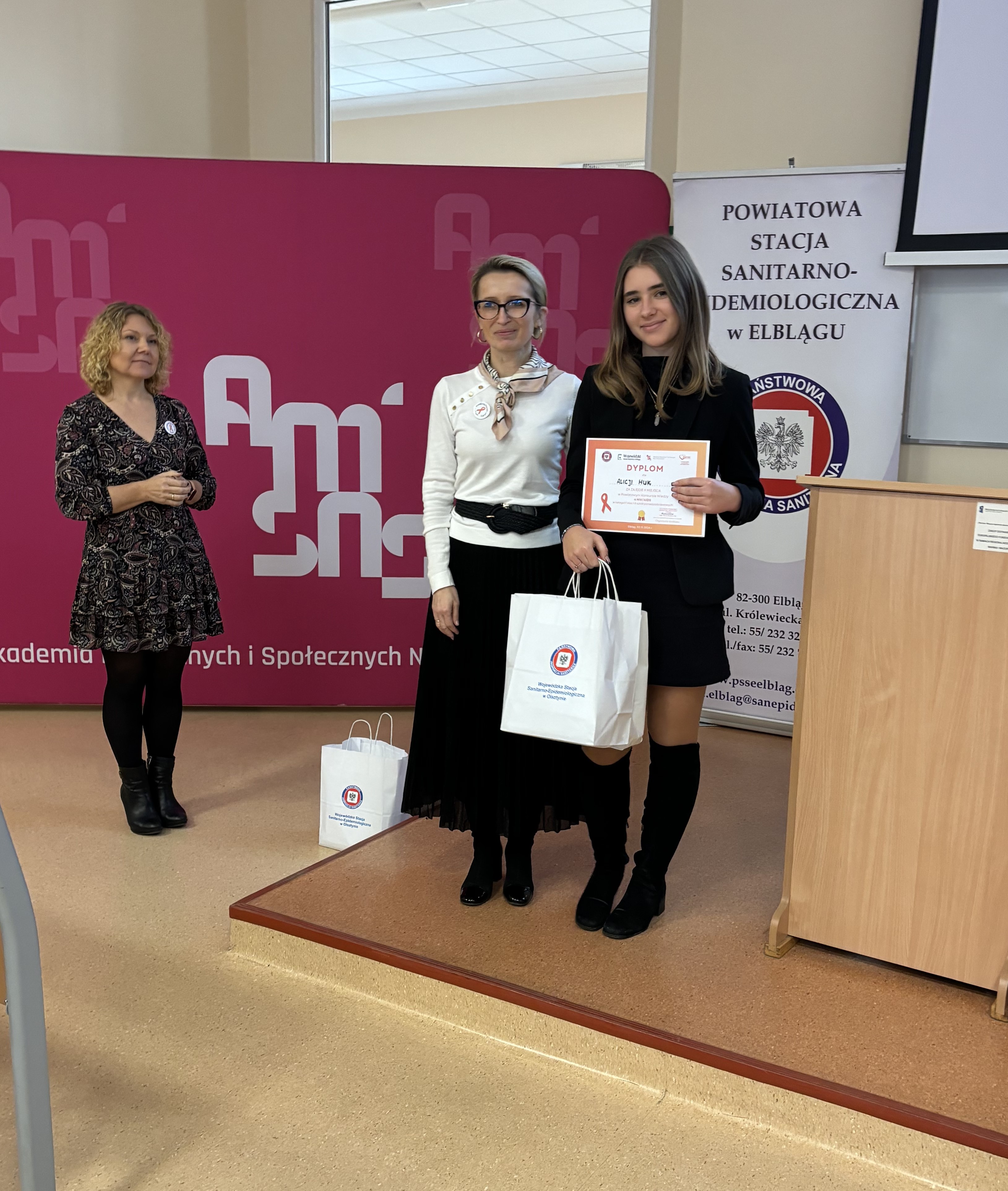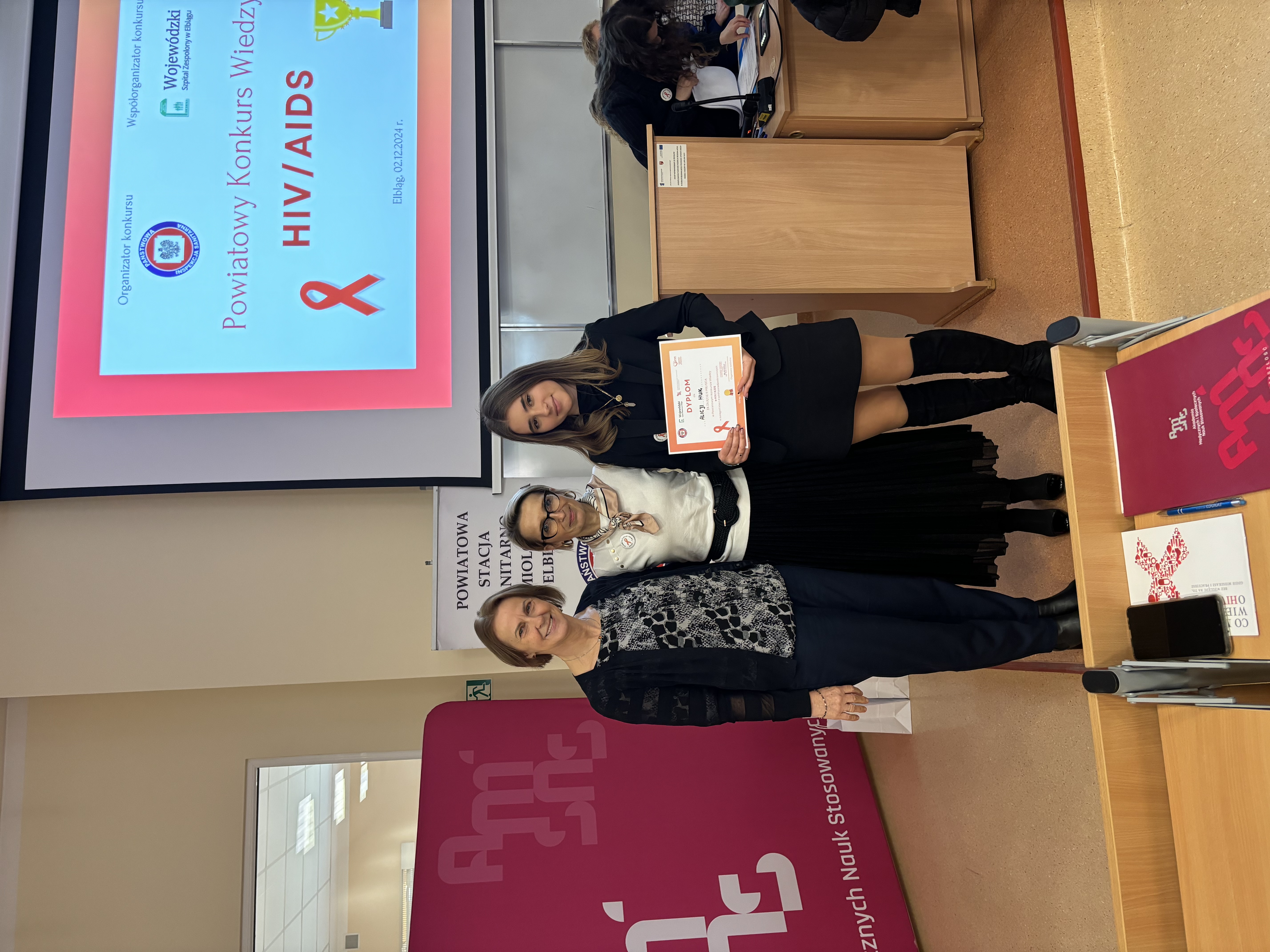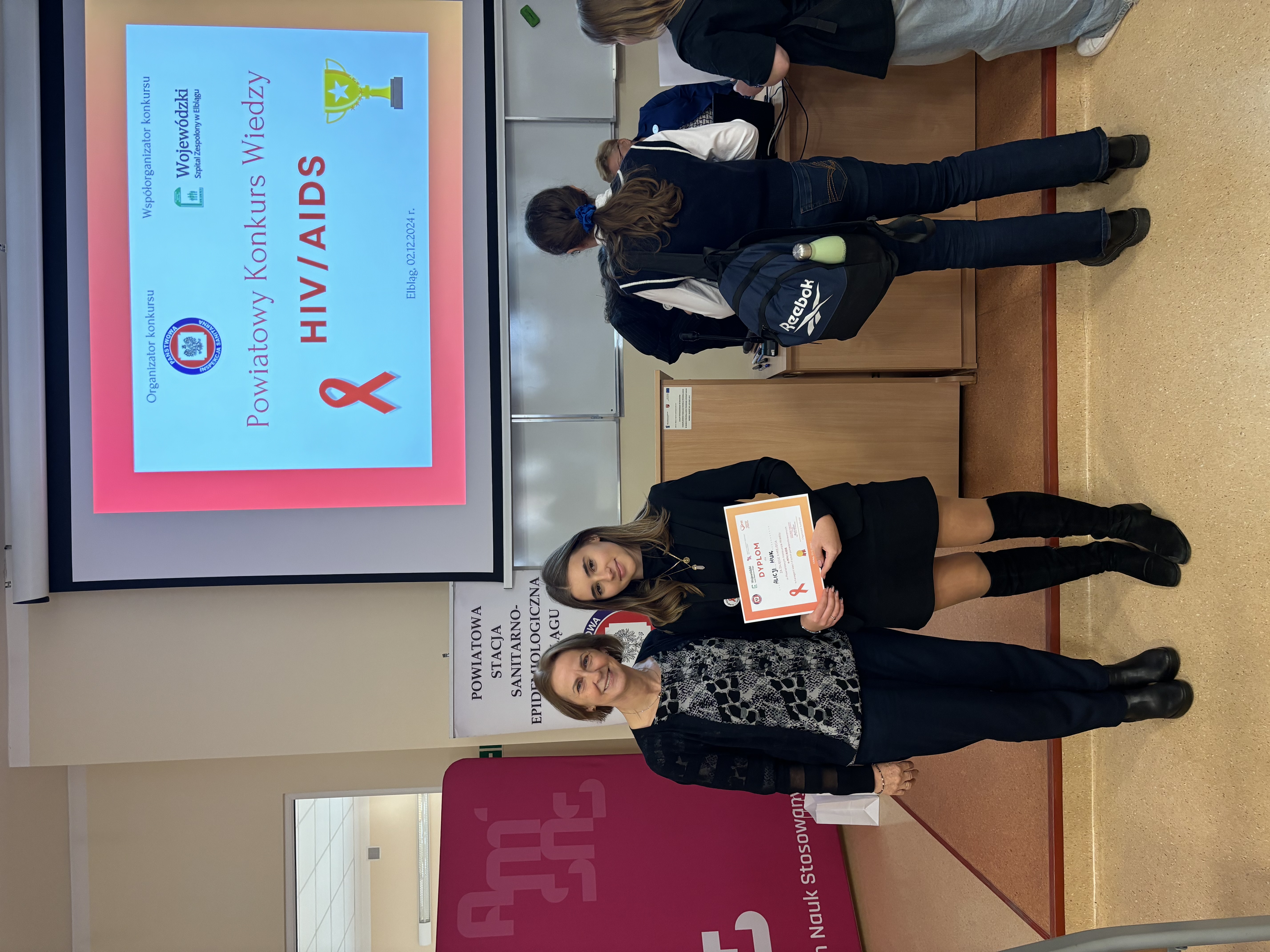 Uczennica, Alicja Huk z klasy II a Liceum Ogólnokształcącego, zajęła II miejsce w kategorii klas pierwszych i drugich szkół średnich w Powiatowym Konkursie Wiedzy o HIV/AIDS. W konkursie zorganizowanym 02.12.2024r. przez Powiatową Stację Sanitarno-Epidemiologiczną w Elblągu, w którym wzięli udział uczniowie ze szkół średnich z Elbląga oraz powiatu elbląskiego. Alicja wykazała się bardzo dużą wiedzą z zakresu m.in. budowy wirusa HIV, dróg szerzenia, zapobiegania zakażeniom. Gratulacje, nagrody i dyplomy laureaci odebrali z rąk dyrekcji organizatora. Gratulujemy Alicji i życzymy dalszych sukcesów.
