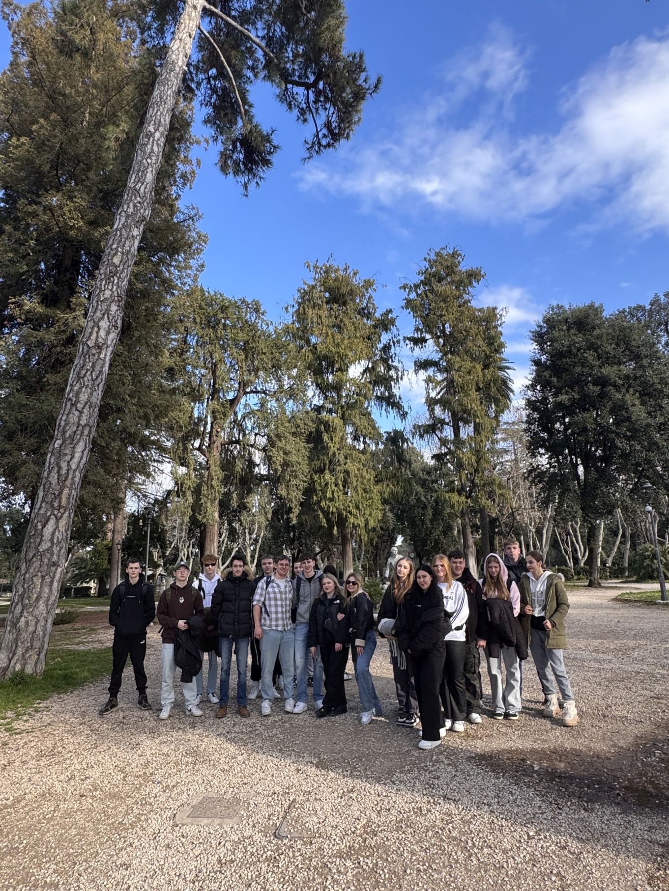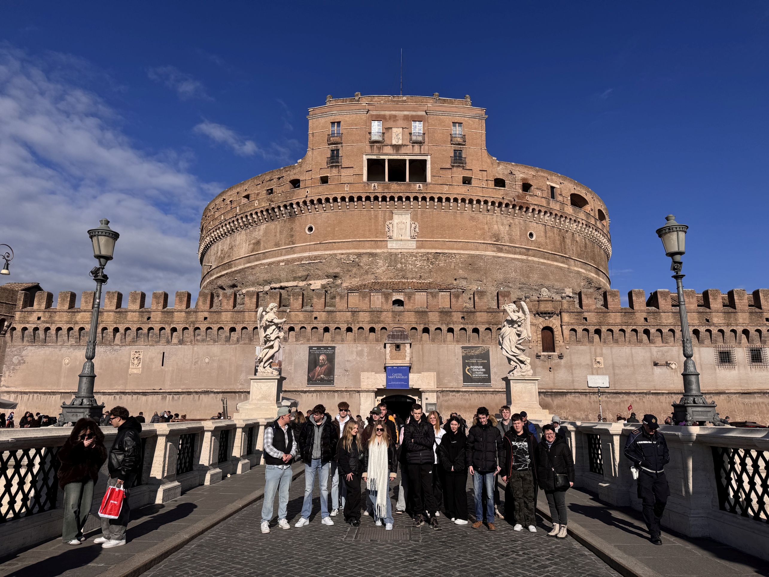 Rzym to jednak nie tylko zabytki, ale także jego niepowtarzalna atmosfera. Spacerując po Zatybrzu, uczniowie poznali bardziej kameralne oblicze miasta – wąskie uliczki, kolorowe fasady domów oraz klimatyczne kawiarenki. Chwile wytchnienia znalazły się również na Hiszpańskich Schodach czy podczas spaceru elegancką dzielnicą z ekskluzywnymi butikami. Nie zabrakło wizyty w Zamku Anioła, skąd z tarasów rozpościerał się zachwycający widok na panoramę Rzymu – od Watykanu po Koloseum. W ogrodach Borghese, w otoczeniu zieleni i dźwięków ulicznej muzyki, uczniowie znaleźli chwilę relaksu, odpoczywając od zgiełku miasta.