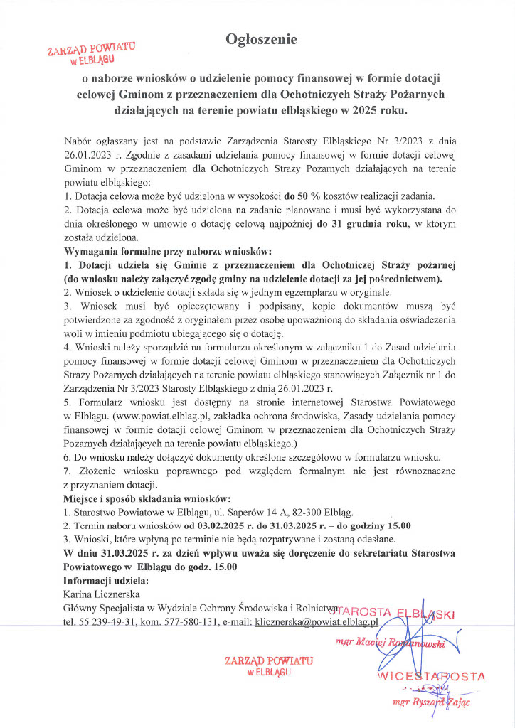 Ogłoszenie o naborze wniosków o udzielenie pomocy finansowej w formie dotacji celowej Gminom z przeznaczeniem dla Ochotniczych Straży Pożarnych działających na terenie powiatu elbląkiego w 2025 roku