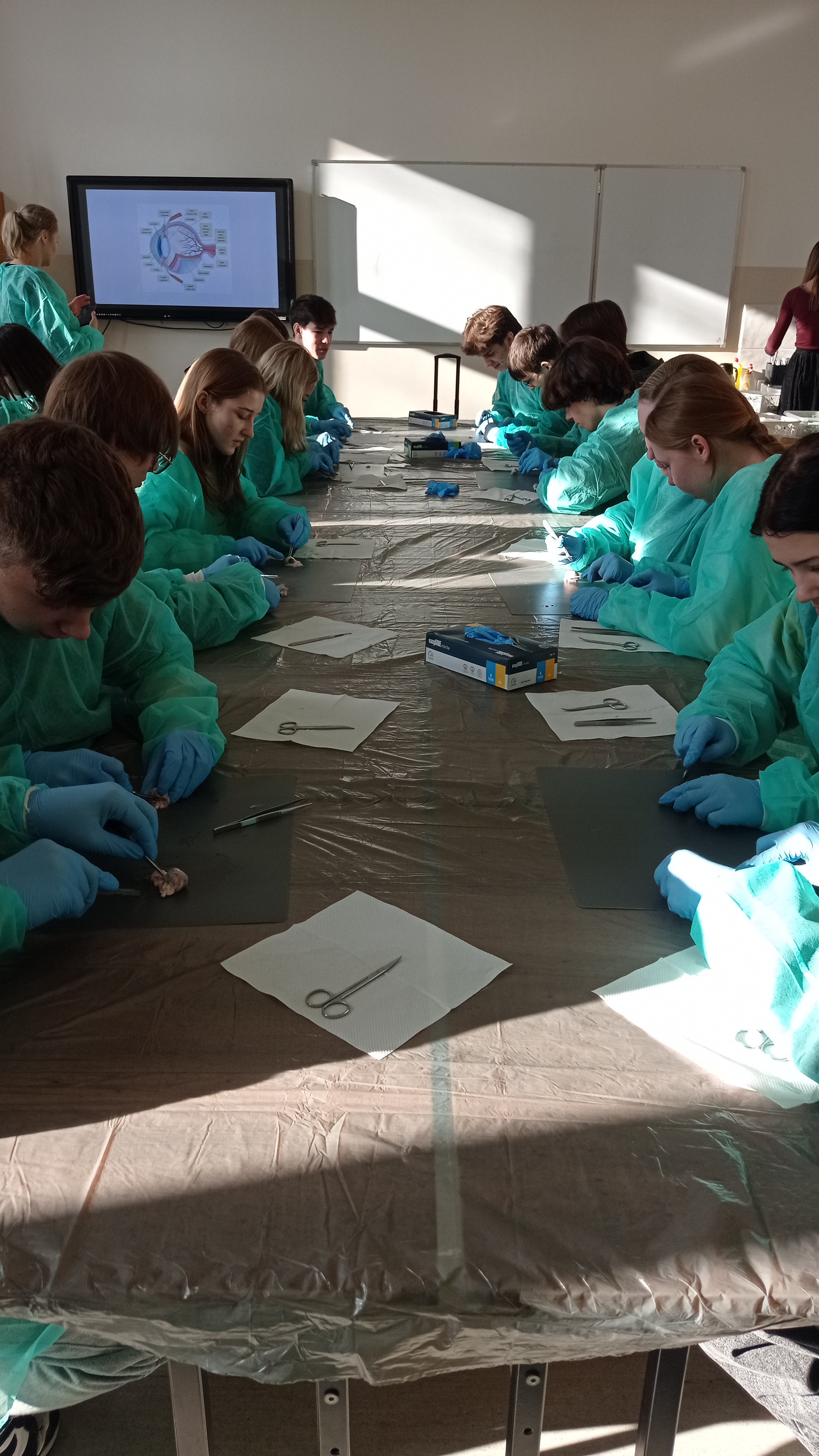 W czwartek, 13 lutego, uczniowie klas o profilu przyrodniczo-medycznym ponownie wzięli udział w warsztatach anatomicznych. Tym razem mieli wyjątkową okazję przyjrzeć się budowie oka od wewnątrz. W trakcie zajęć uczestnicy precyzyjnie rozcinali gałkę oczną, wydobywając z niej soczewkę oraz inne struktury, takie jak siatkówka i naczyniówka.