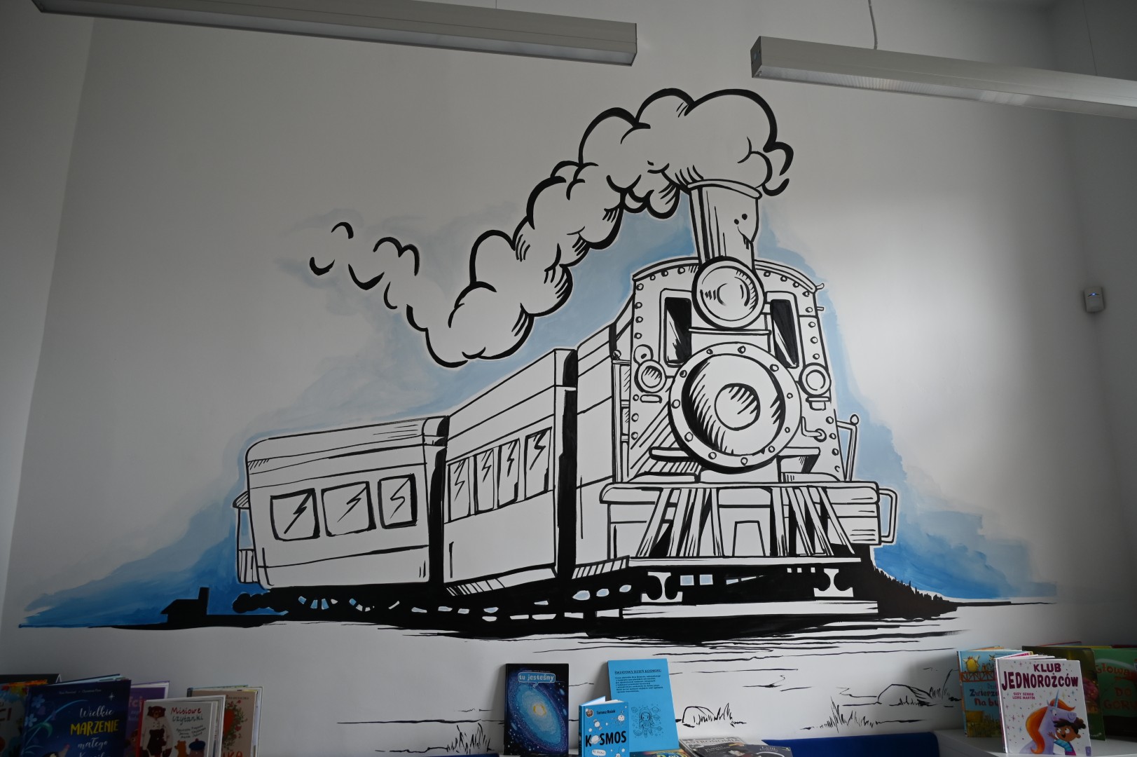 Pracowaliśmy w skupieniu i z wielkim zapałem, trochę tylko przestraszeni wizerunkiem rozpędzonej lokomotywy, realistycznie wyobrażonej na jednej ze ścian i pędzącej na nas z wielką prędkością, a wcale nie tak „powoli – jak żółw – ociężale”, jak to w wierszu Juliana Tuwima zostało opisane. Jednak pomimo wszystkich przeszkód, tych wyobrażonych i rzeczywistych (ręce seniorów już nie tak sprawne), pojawiły się wkrótce wspaniałe torby na książki – ozdobione kwiatami, liśćmi, wstążkami, motylami oraz opisane hasłami wielbiącymi słowo pisane, ideę czytania i sławiącymi rolę bibliotek w naszym życiu.
