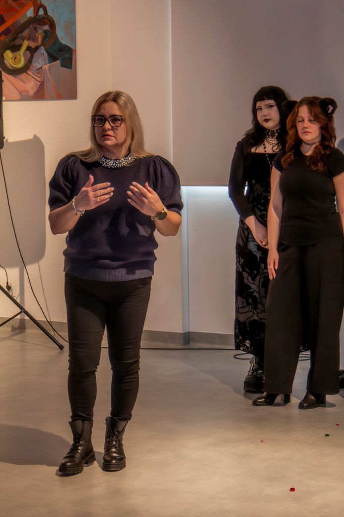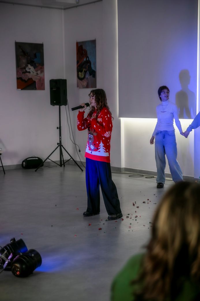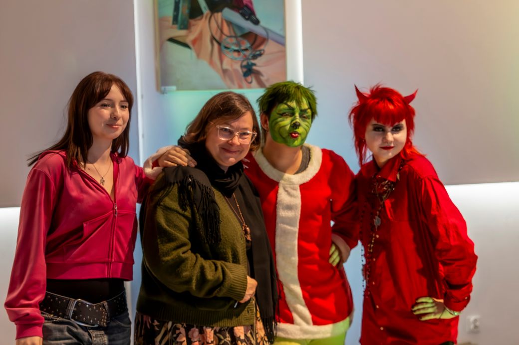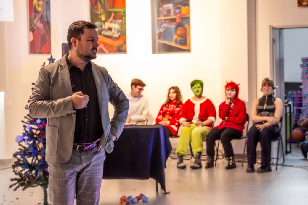 Narratorzy: Oliwia Tessar oraz Marta Milczanowska, poprowadziły widzów przez historię z wyczuciem rytmu, ironią i sceniczną pewnością, tworząc spójną klamrę całego spektaklu. W rolę pani Bro brawurowo wcieliła się Nina Makowska, zachwycając publiczność energią, doskonałym wyczuciem komediowym oraz autoironią pani Agnieszki. Jej kreacja była jednocześnie zabawna, prawdziwa i bardzo „ludzka”. Z kolei Olek Kazimierczak jako Grinch stworzył postać wyrazistą, charyzmatyczną i pełną sarkazmu: taką, której nie sposób było nie zapamiętać. Jego gra spotkała się z wyjątkowo ciepłym odbiorem widowni.