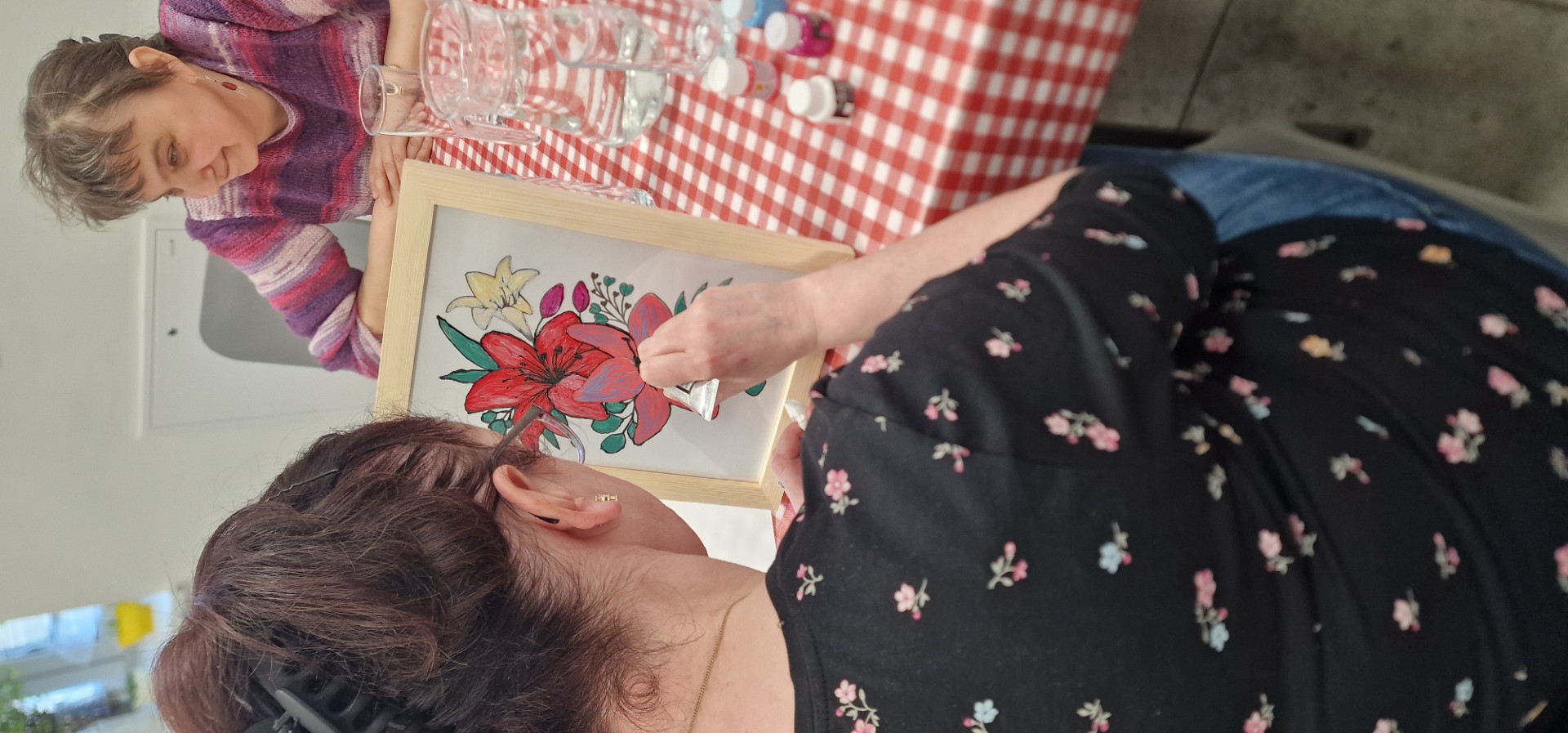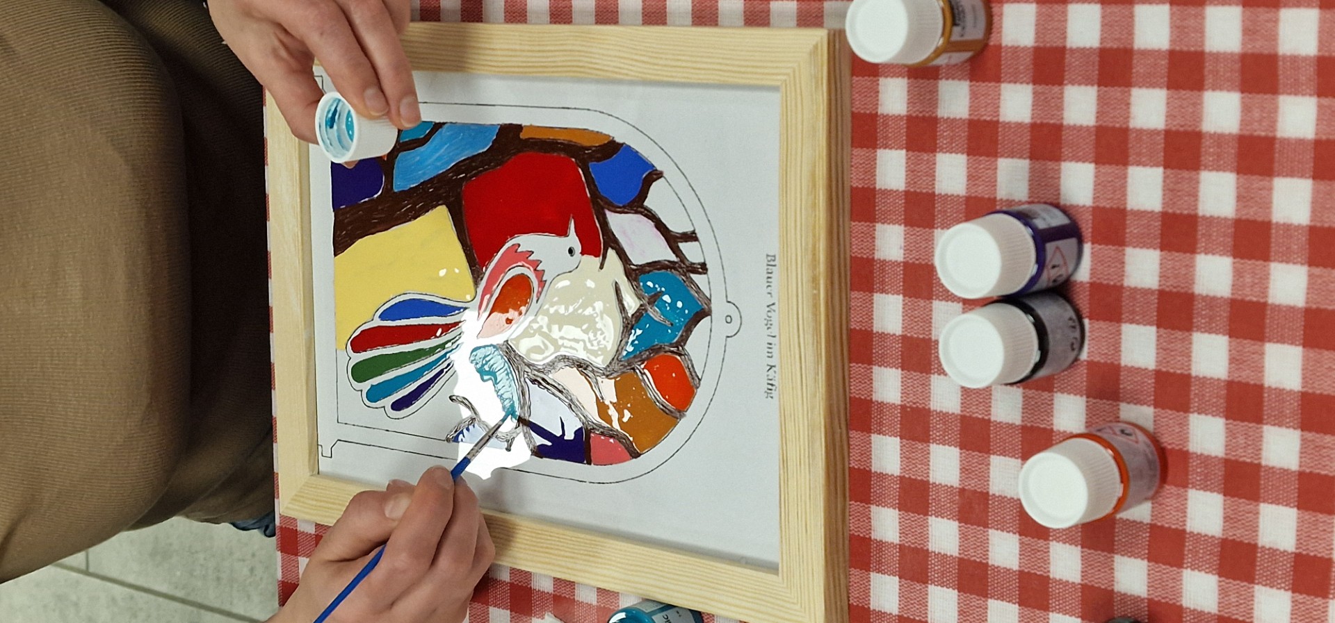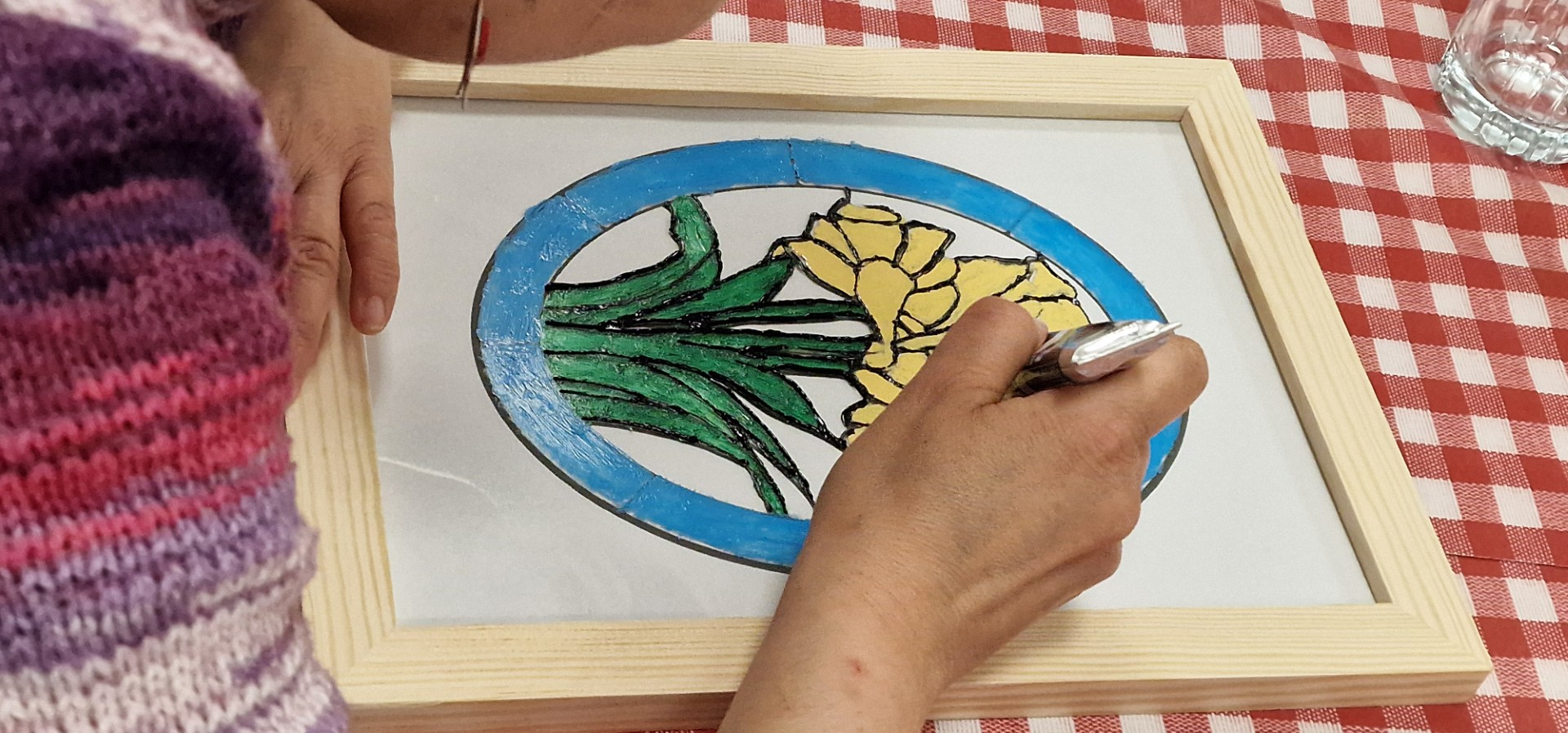 Postanowiliśmy na tych emocjach zagrać, ślęcząc nad wybranymi kompozycjami tworzyliśmy myśląc bardziej o wrażeniu, które wywrzemy na potencjalnym odbiorcy, zapominając o sobie. Najpierw w naszym warsztacie było gwarno i wesoło, piliśmy kawę, rozmawialiśmy, ale w miarę upływu czasu odgłosy przycichały, spowijała nas cisza, na naszych twarzach malowała się koncentracja i mentalny wysiłek. Gdyż malowane przez nas „na szkle” motywy wymagały wielkiej uwagi, delikatnego prowadzenia ręki, by nie wychodzić poza linie oraz wyobraźni, by pola między konturami wypełniać odpowiednio stonowanymi i harmonizującymi ze sobą barwnymi plamami.