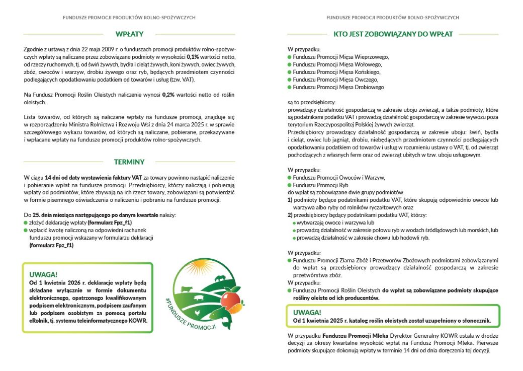 W związku z nowelizacją ustawy o funduszach promocji produktów rolno-spożywczych (Dz. U. z 2025 r. poz. 683) od 1 kwietnia 2026 r. wprowadzony został obowiązek składania deklaracji wpłat na fundusze promocji produktów rolno-spożywczych, wyłącznie za pośrednictwem systemu teleinformatycznego KOWR tj. poprzez platformę usług eRolnik: https://erolnik.gov.pl/#/ .