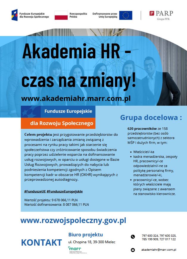 Agencja Rozwoju Regionalnego „MARR” S.A. jako Operator projektu „Akademia HR – czas na zmiany” realizowanego na podstawie umowy o dofinansowanie zawartej z Polską Agencją Rozwoju Przedsiębiorczości zaprasza do udziału w ww. projekcie mikro i małych przedsiębiorców.