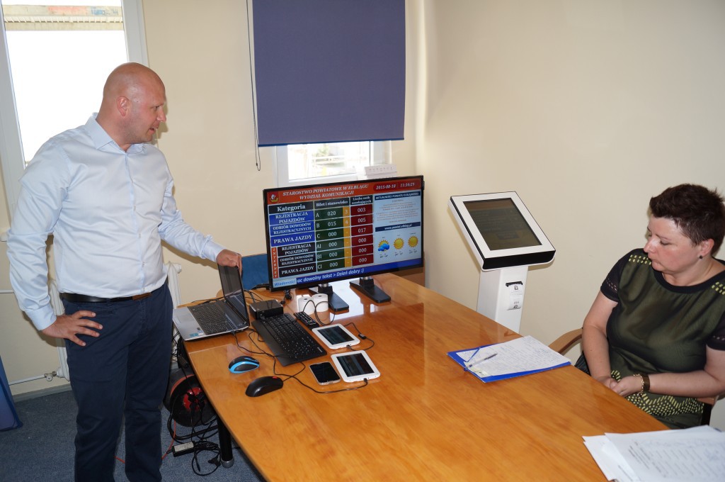 W dniu 18.08.2015 r. na posiedzeniu Zarządu Powiatu przedstawiciel firmy AJHmedia Sp. z o.o. zaprezentował funkcjonowanie systemu kolejkowego. Zarząd Powiatu podjął decyzję o zainstalowaniu od września w Wydziale Komunikacji i Transportu na trzymiesięczny okres próby zaprezentowanego systemu. Kolejkomat zapewni komfortowe środowisko pracy oraz przejrzystą obsługę osób odwiedzających urząd. Jeśli się sprawdzi, pozostanie w Starostwie na dłużej.