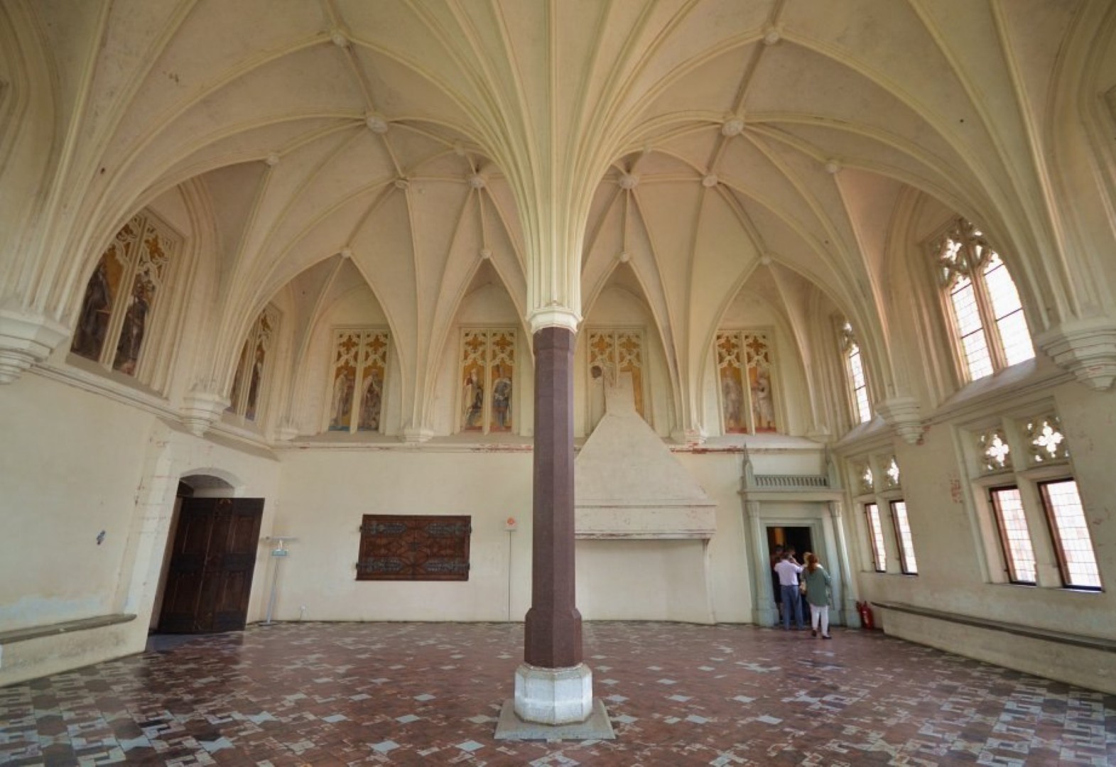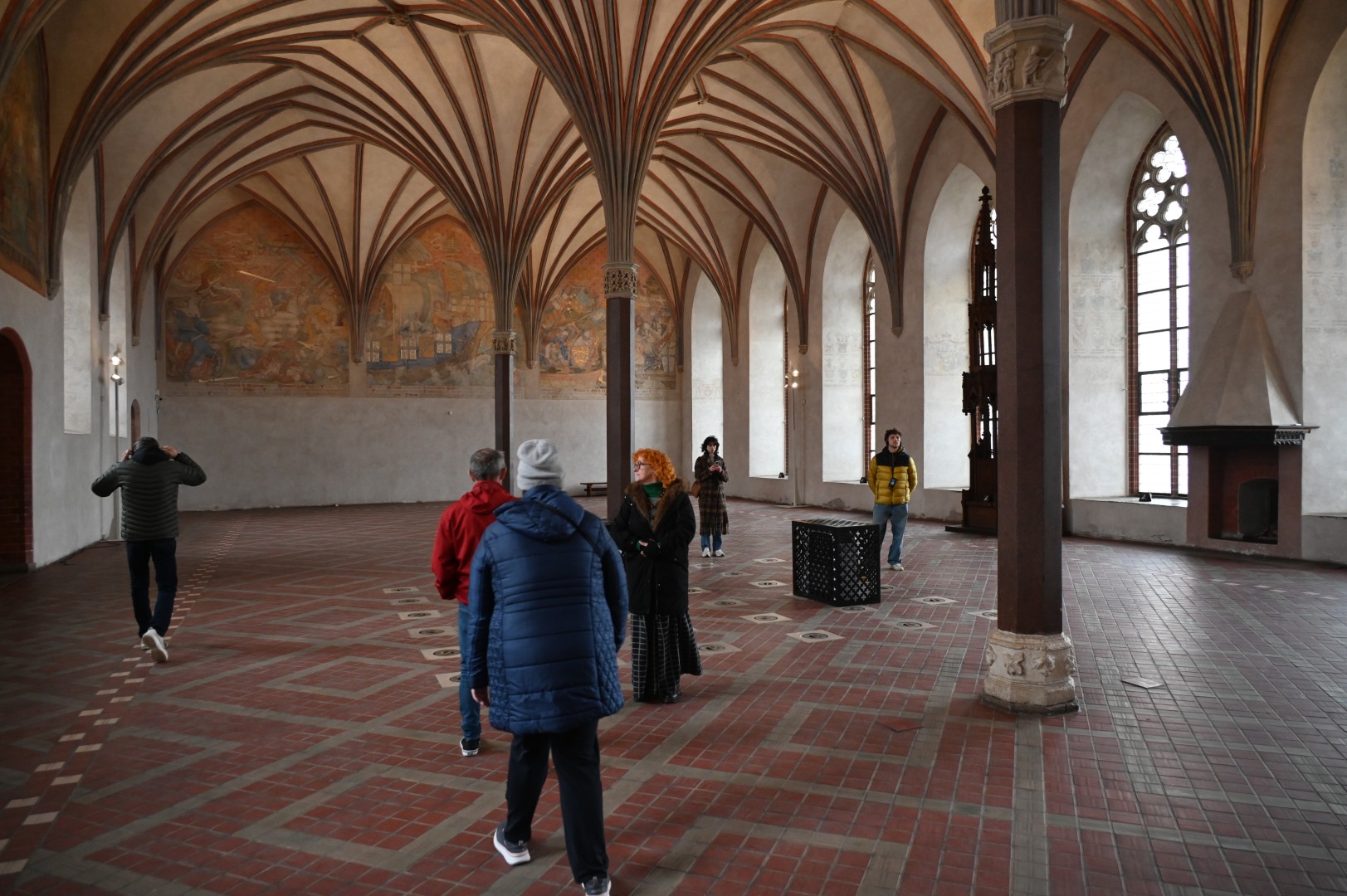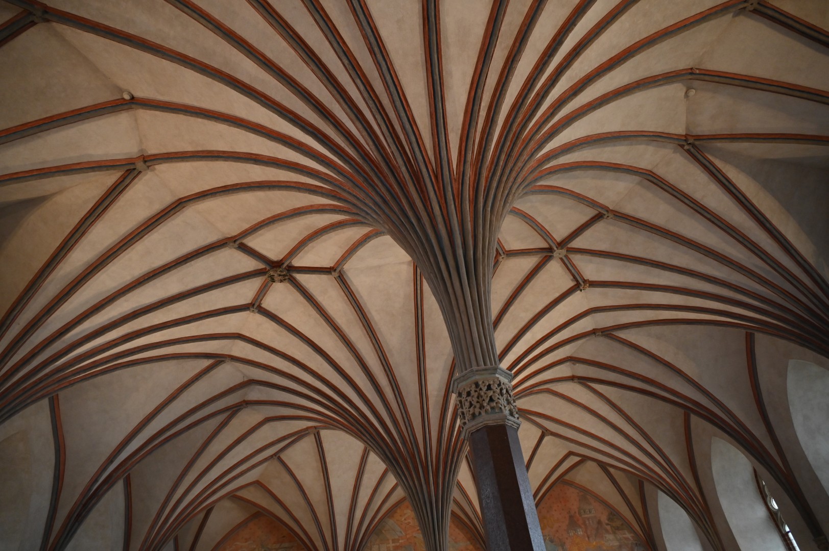 Wreszcie usiedliśmy w kolejnym wielkim i reprezentacyjnym pomieszczeniu, jak się okazało w Letnim Refektarzu (bo obok jest też Refektarz Zimowy). Tutaj zdumiał nas widok żebrowego sklepienia wspartego na jednej tylko kolumnie, ktoś pięknie to opisał porównując jego konstrukcję do widoku palmowego liścia spływającego lekko na ściany, a właściwie unoszącego się w powietrzu. Pełnił ów refektarz rolę sali audiencyjnej, gdzie przyjmowano obce poselstwa i organizowano bardzo ważne narady, na których zapadały decyzje wpływające na bieg historii i sposób urządzania świata. O jednej takiej naradzie mówi legenda związana z kamienną kulą tkwiącą w ścianie, jest to tzw. Polenkugel, która budziła w Prusakach przez wieki uczucia trwogi, ale też nienawiści i złości. Gdyby bowiem się udało, gdyby kula nie chybiła o trzy palce, dzieje obszaru leżącego w północnej Europie, na południowym wybrzeżu Bałtyku, mogły się potoczyć zupełnie inaczej. Trzech palców zabrakło, czyli gdzieś tak 5 cm !