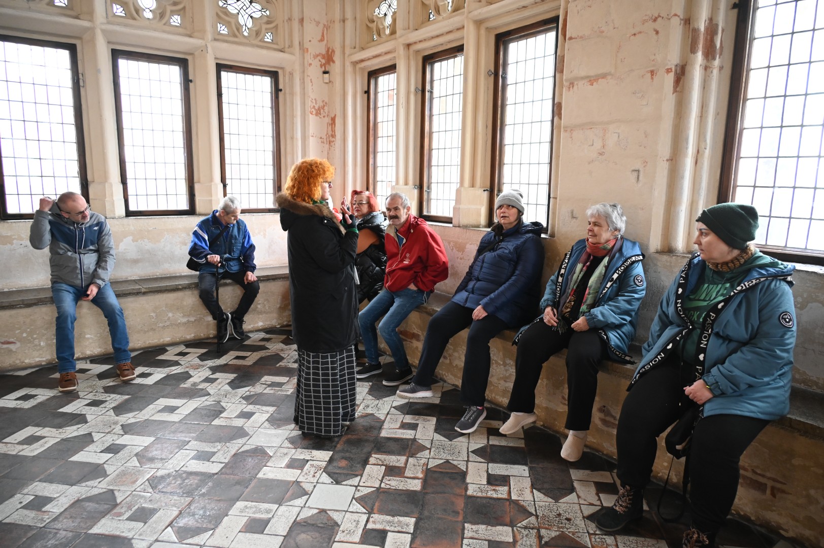 Słuchając tych opowieści Pani Małgorzaty udaliśmy się w kierunku Zamku Średniego podziwiając jego podkowiasty kształt złożony z trzech skrzydeł obejmujących niezwykle rozległy dziedziniec założony na planie trapezu. Ileż na tym dziedzińcu musiało się kiedyś dziać!, jaki tu panował gwar i rwetes! O ile na dziedzińcu Zamku Wysokiego dominowała cisza i religijne skupienie, tu toczyło się wartko życie we wszystkich jego odcieniach. Pojawiali się tu licznie, tak jak dziś turyści, goście zakonu, czyli głównie rycerze wspomagający Krzyżaków w ich podbojach terytorialnych maskowanych pod ideą szerzenia chrześcijaństwa. Przybyszów z zachodniej i południowej Europy, w tym też władców feudalnych, dyplomatów, posłów, dworzan i dostojników kościoła przyjmowano w skrzydle wschodnim – dla ich potrzeby wzniesiono kaplicę pw. św. Bartłomieja.